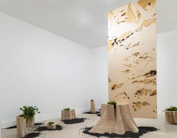 Ces œuvres s'inspirent de la dualité entre l'obscurité et la lumière faisant allusion à une éclipse. Les perles de sabre sont l'arc brisé d'illumination entourant la lune. L'or a été sculpté avec un cutter laser pour être endommagé et cassé. Ce sont des références à la relation entre la nature et l'humanité.